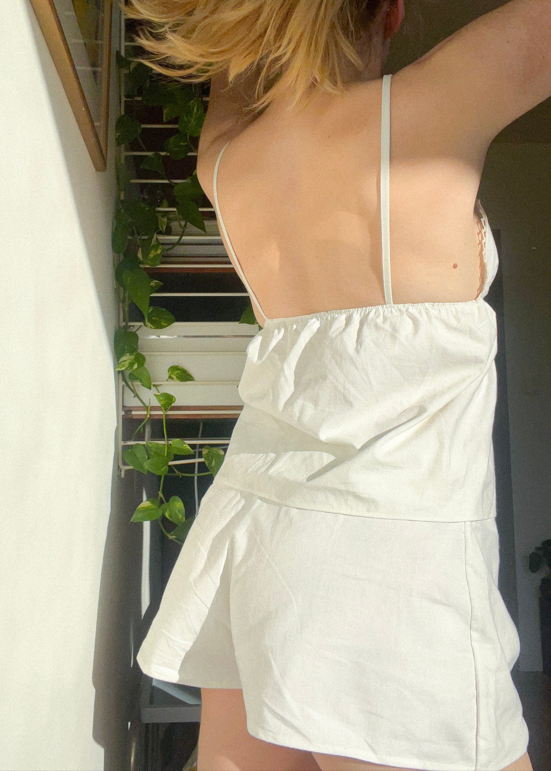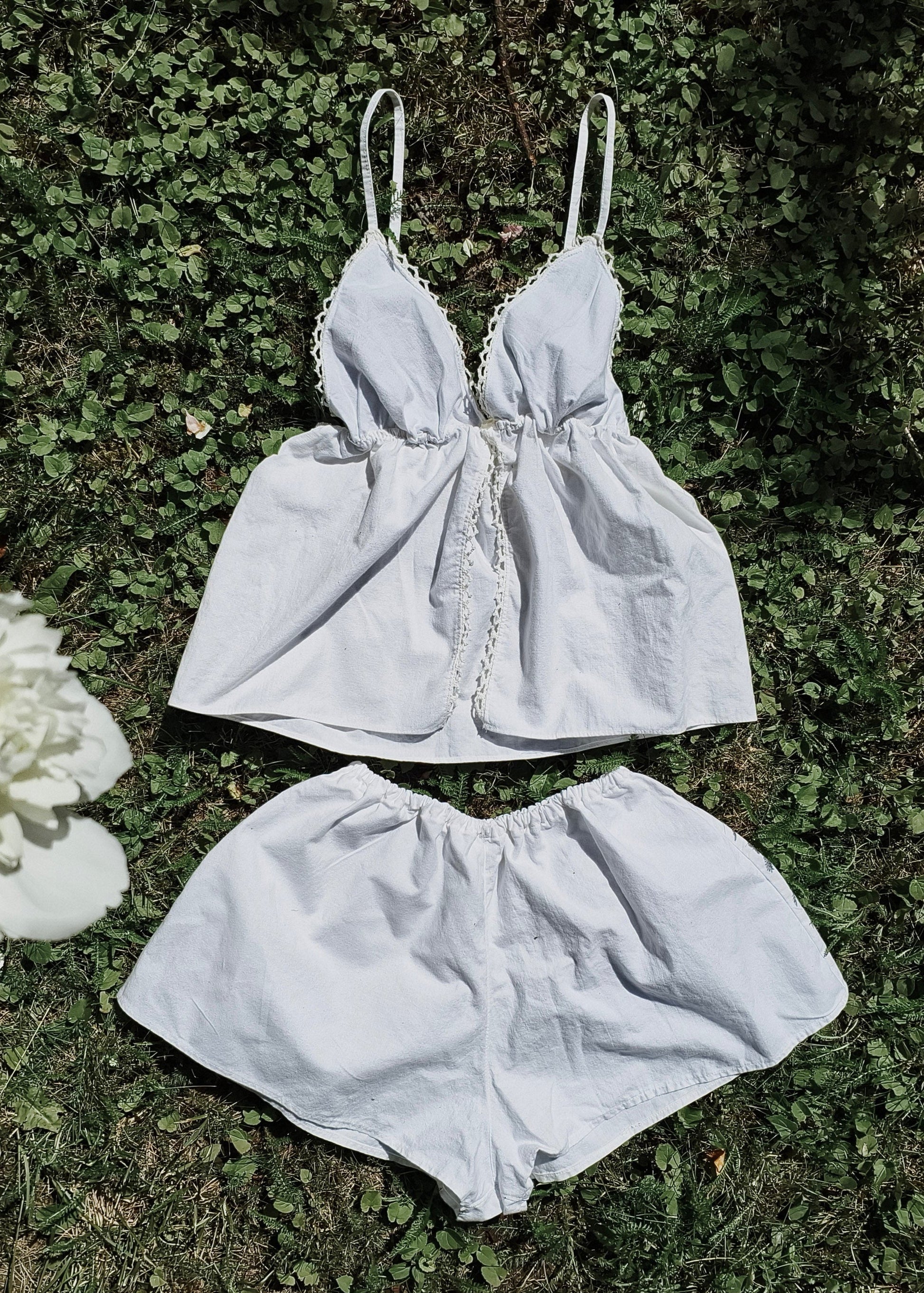 The Clair Sleep Set is designed for restful mornings and soothing nights. This airy two-piece set includes a relaxed-fit top and matching shorts, providing a comfortable, lightweight feel against the skin.